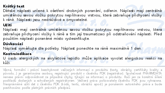 Dětské náplasti určené k ošetření drobných poranění, odřenin. Náplasti mají centrálně umístěnou savou vložku pokrytou nepřilnavou vrstvou, která zabraňuje přichycení vložky k ráně. Náplasti jsou nedráždivé a omyvatelné.