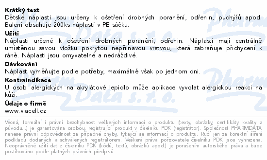 Dětské náplasti jsou určeny k ošetření drobných poranění, odřenin, puchýřů apod. Balení obsahuje 200ks náplastí v PE sáčku.