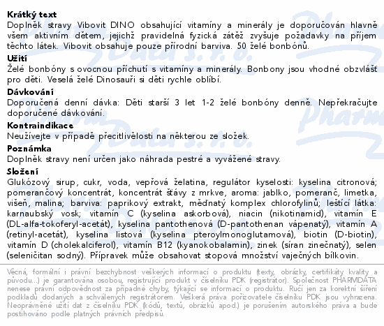 Doplněk stravy Vibovit DINO obsahující vitamíny a minerály je doporučován hlavně všem aktivním dětem, jejichž pravidelná fyzická zátěž zvyšuje požadavky na příjem těchto látek. Vibovit obsahuje pouze přírodní barviva. 50 želé bonbónů.