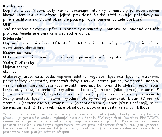 Doplněk stravy Vibovit Jelly Farma obsahující vitamíny a minerály je doporučován hlavně všem aktivním dětem, jejichž pravidelná fyzická zátěž zvyšuje požadavky na příjem těchto látek. Vibovit obsahuje pouze přírodní barviva. 50 želé bonbónů.