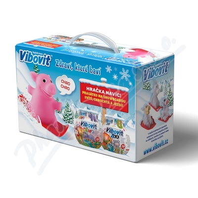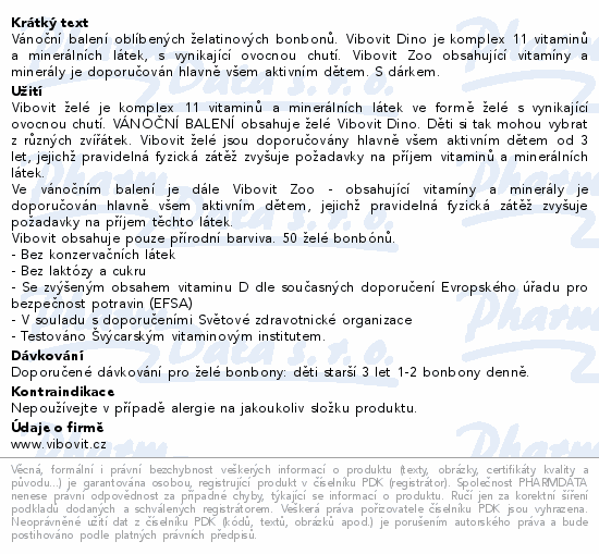 Vánoční balení oblíbených želatinových bonbonů. Vibovit Dino je komplex 11 vitaminů a minerálních látek, s vynikající ovocnou chutí. Vibovit Zoo obsahující vitamíny a minerály je doporučován hlavně všem aktivním dětem. S dárkem.