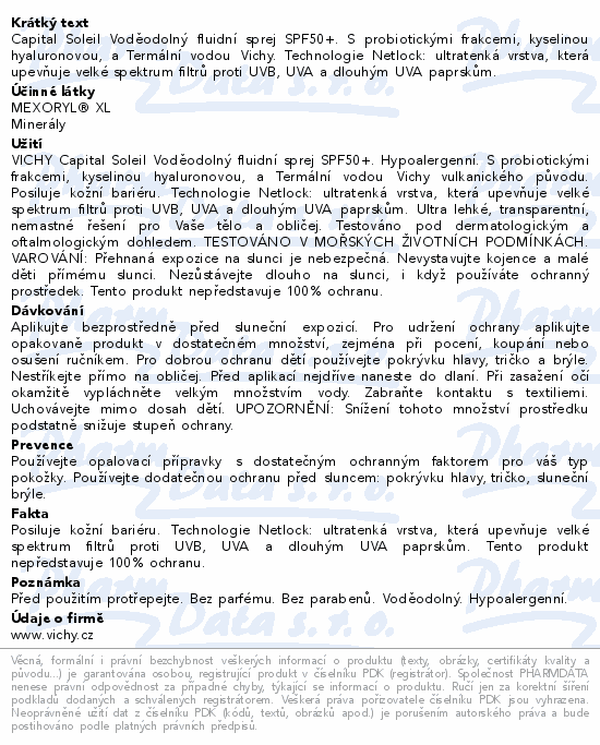 Capital Soleil Voděodolný fluidní sprej SPF50+. S probiotickými frakcemi, kyselinou hyaluronovou, a Termální vodou Vichy. Technologie Netlock: ultratenká vrstva, která upevňuje velké spektrum filtrů proti UVB, UVA a dlouhým UVA paprskům.