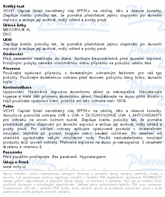 VICHY Capital Soleil neviditelný olej SPF50+ na obličej, tělo a vlasové konečky. Zlepšuje kvalitu pokožky tak, že pomáhá předcházet jejímu olupování po sluneční expozici a snižuje její suchost, mdlý vzhled a pocity pnutí.