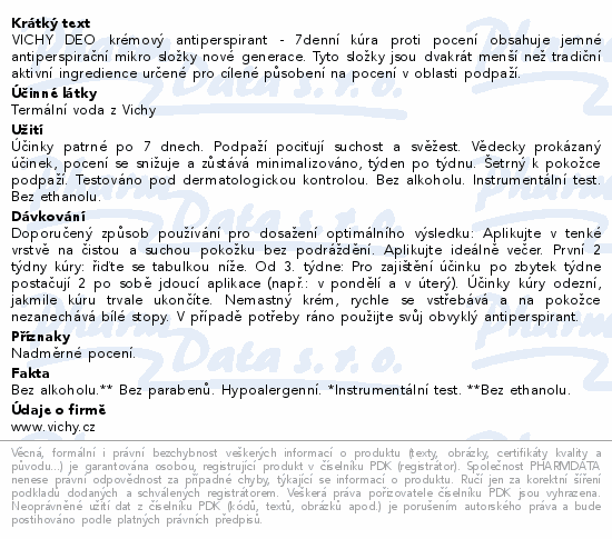 VICHY DEO krémový antiperspirant - 7denní kúra proti pocení obsahuje jemné antiperspirační mikro složky nové generace. Tyto složky jsou dvakrát menší než tradiční aktivní ingredience určené pro cílené působení na pocení v oblasti podpaží.