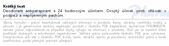 Deodorant antiperspirant s 24 hodinovým účinkem. Dvojitý účinek proti vlhkosti v podpaží a nepříjemným pachům.