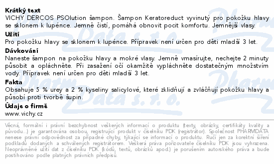 VICHY DERCOS PSOlution šampon. Šampon Keratoreduct vyvinutý pro pokožku hlavy se sklonem k lupénce. Jemně čistí, pomáhá obnovit pocit komfortu. Jemnější vlasy.