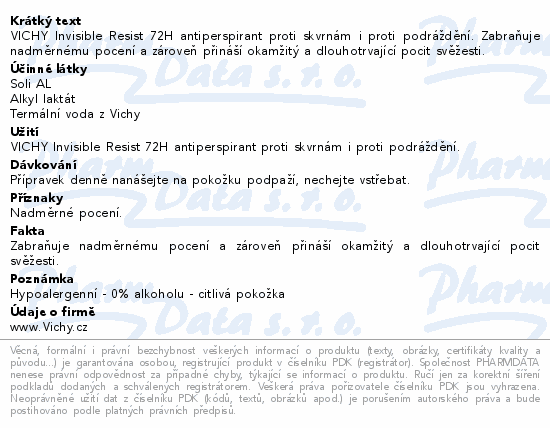 VICHY Invisible Resist 72H antiperspirant proti skvrnám i proti podráždění. Zabraňuje nadměrnému pocení a zároveň přináší okamžitý a dlouhotrvající pocit svěžesti.