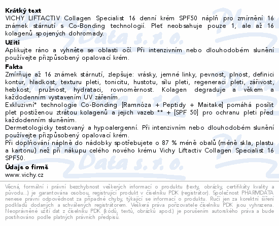 VICHY LIFTACTIV Collagen Specialist 16 denní krém SPF50 náplň pro zmírnění 16 známek stárnutí s Co-Bonding technologií. Pleť neobsahuje pouze 1, ale až 16 kolagenů spojených dohromady.