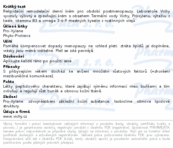 Relipidační remodelační denní krém pro období postmenopauzy. Laboratoře Vichy vyvinuly výživný a zpevňující krém s obsahem Termální vody Vichy, Proxylanu, výtažku z kasie, vitaminu B3 a omega 3-6-9 mastných kyselin z rostlinných olejů.