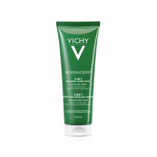 NORMADERM TRI-ACTIV CLEANSER - Přípravek pro čistění pleti s nedokonalostmi 3v1: čištění, peeling, maska, 125ml. Krém odstraňuje nečistoty, jako peeling uvolňuje ucpané póry. Při použití jako maska: zmatňuje a rozjasňuje pleť.