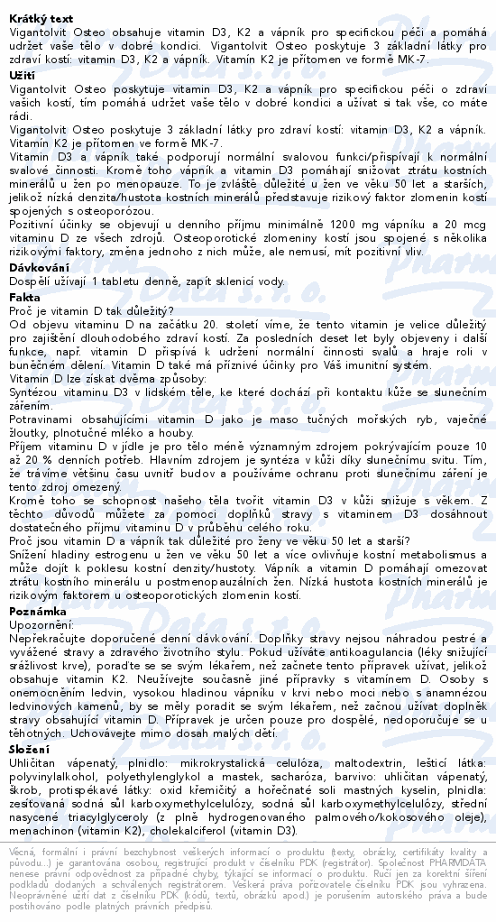 Vigantolvit Osteo obsahuje vitamin D3, K2 a vápník pro specifickou péči a pomáhá udržet vaše tělo v dobré kondici. Vigantolvit Osteo poskytuje 3 základní látky pro zdraví kostí: vitamin D3, K2 a vápník. Vitamín K2 je přítomen ve formě MK-7.