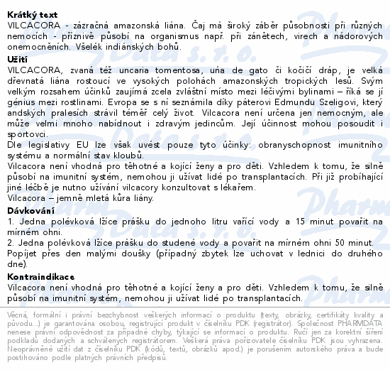 VILCACORA - zázračná amazonská liána. Čaj má široký záběr působnosti při různých nemocích - příznivě působí na organismus např. při zánětech, virech a nádorových onemocněních. Všelék indiánských bohů.
