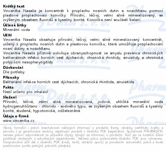 Vincentka Nasalis je koncentrát k proplachu nosních dutin a nosohltanu pomocí plastové proplachovací konvičky. Přírodní, léčivý, velmi silně mineralizovaný, se zvýšeným obsahem fluoridů a kyseliny borité. Konvička není součástí balení.