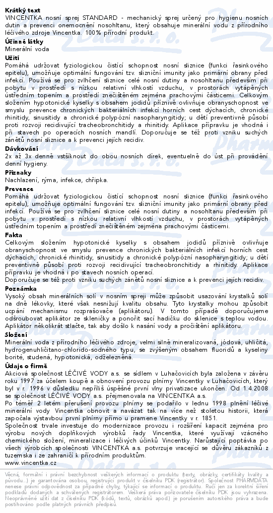 VINCENTKA nosní sprej STANDARD - mechanický sprej určený pro hygienu nosních dutin a prevenci onemocnění nosohltanu, který obsahuje minerální vodu z přírodního léčivého zdroje Vincentka. 100% přírodní produkt.