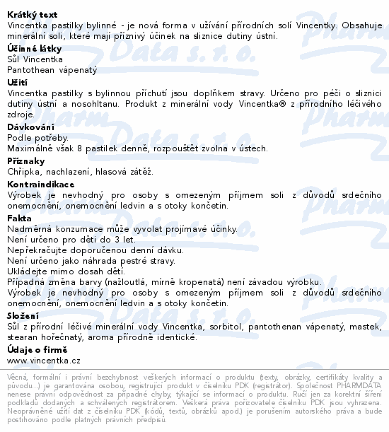 Vincentka pastilky bylinné - je nová forma v užívání přírodních solí Vincentky. Obsahuje minerální soli, které mají příznivý účinek na sliznice dutiny ústní.