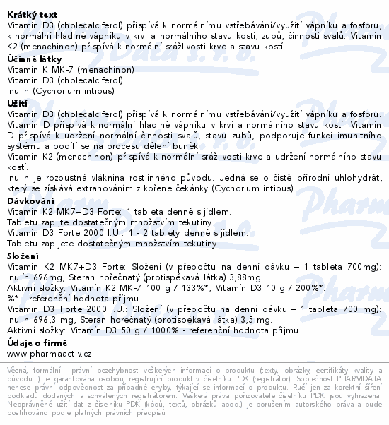 Složení (v přepočtu na denní dávku - 1 tableta 300 mg): Mikrokrystalická celulóza 296,89 mg Stearan hořečnatý (protispékavá látka) 2mg, talek (plnidlo) 1mg. Aktivní složky: Vitamín K2 MK-7 100 mcg (133 %*); Vitamín D3 10 mcg (200 %*)