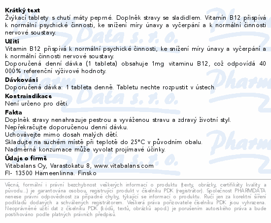 Žvýkací tablety s chutí máty peprné. Doplněk stravy se sladidlem. Vitamín B12 přispívá k normální psychické činnosti, ke snížení míry únavy a vyčerpání a k normální činnosti nervové soustavy.