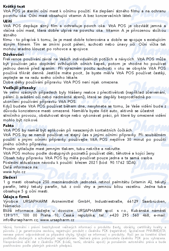 VitA POS je sterilní oční mast k očnímu použití. Ke zlepšení slzného filmu a na ochranu povrchu oka. Oční mast obsahující vitamin A bez konzervačních látek.