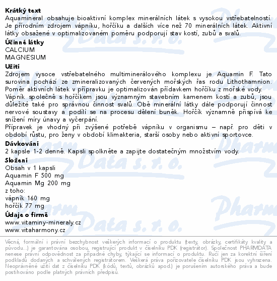 Aquamineral obsahuje bioaktivní komplex minerálních látek s vysokou vstřebatelností. Je přírodním zdrojem vápníku, hořčíku a dalších více než 70 minerálních látek. Aktivní látky obsažené v optimalizovaném poměru podporují stav kostí, zubů a svalů.