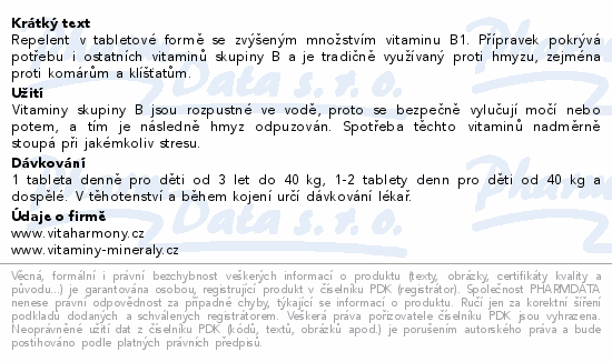 Repelent v tabletové formě se zvýšeným množstvím vitaminu B1. Přípravek pokrývá potřebu i ostatních vitaminů skupiny B a je tradičně využívaný proti hmyzu, zejména proti komárům a klíšťatům.