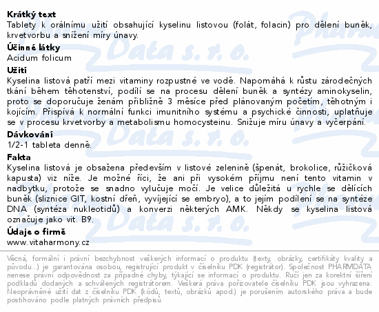 Tablety k orálnímu užití obsahující kyselinu listovou (folát, folacin) pro dělení buněk, krvetvorbu a snížení míry únavy.