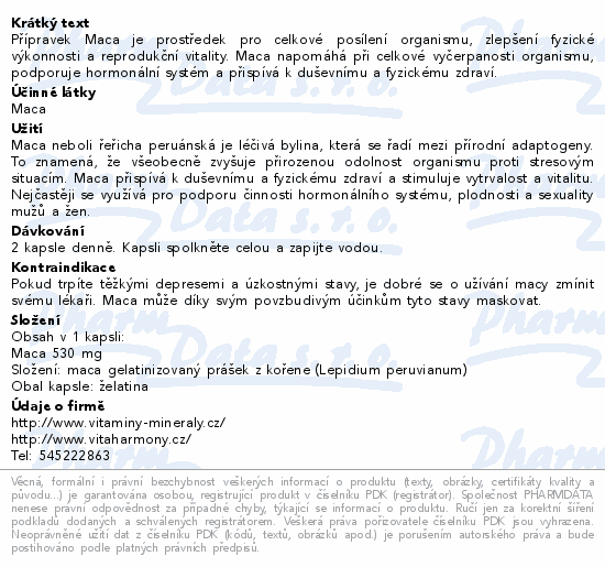 Přípravek Maca je prostředek pro celkové posílení organismu, zlepšení fyzické výkonnosti a reprodukční vitality. Maca napomáhá při celkové vyčerpanosti organismu, podporuje hormonální systém a přispívá k duševnímu a fyzickému zdraví.