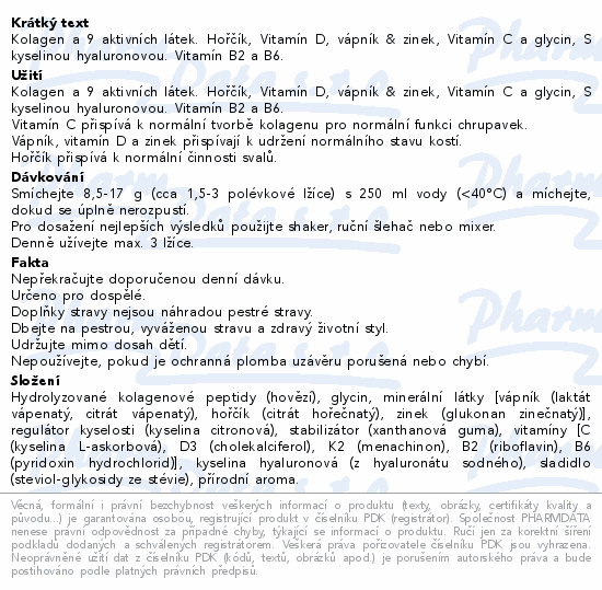 Kolagen a 9 aktivních látek. Hořčík, Vitamín D, vápník & zinek, Vitamín C a glycin, S kyselinou hyaluronovou. Vitamín B2 a B6.