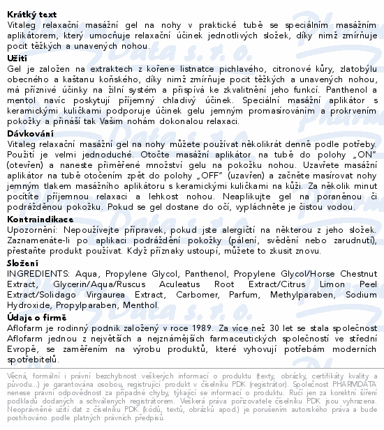 Vitaleg relaxační masážní gel na nohy v praktické tubě se speciálním masážním aplikátorem, který umocňuje relaxační účinek jednotlivých složek, díky nimž zmírňuje pocit těžkých a unavených nohou.