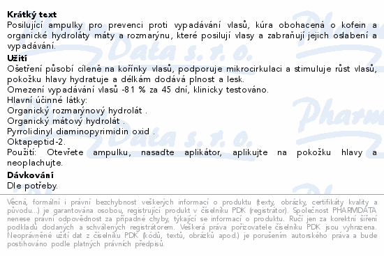 Posilující ampulky pro prevenci proti vypadávání vlasů, kúra obohacená o kofein a organické hydroláty máty a rozmarýnu, které posilují vlasy a zabraňují jejich oslabení a vypadávání.