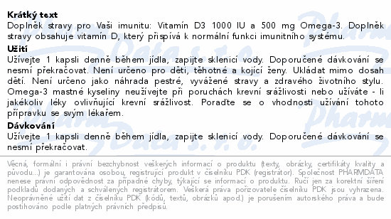 Doplněk stravy pro Vaši imunitu: Vitamín D3 1000 IU a 500 mg Omega-3. Doplněk stravy obsahuje vitamín D, který přispívá k normální funkci imunitního systému.