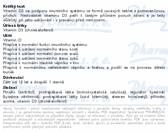 Vitamín D3 na podporu imunitního systému ve formě cucavých tablet s pomerančovou příchutí. Nedostatek vitamínu D3 patří k častým příčinám poruch zdraví a je tedy důležitý při jeho udržování i v prevenci před nemocemi.
