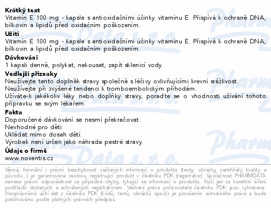 Vitamín E 100 mg - kapsle s antioxidačními účinky vitamínu E. Přispívá k ochraně DNA, bílkovin a lipidů před oxidačním poškozením.