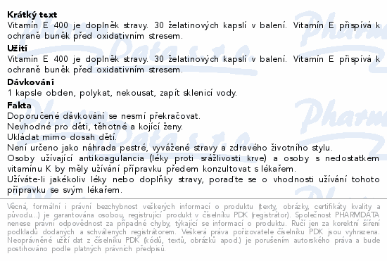 Vitamín E 400 je doplněk stravy. 30 želatinových kapslí v balení. Vitamín E přispívá k ochraně buněk před oxidativním stresem.