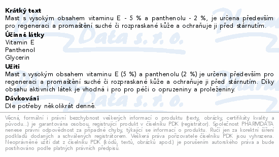 Mast s vysokým obsahem vitaminu E - 5 % a panthenolu - 2 %, je určena především pro regeneraci a promaštění suché či rozpraskané kůže a ochraňuje ji před stárnutím.