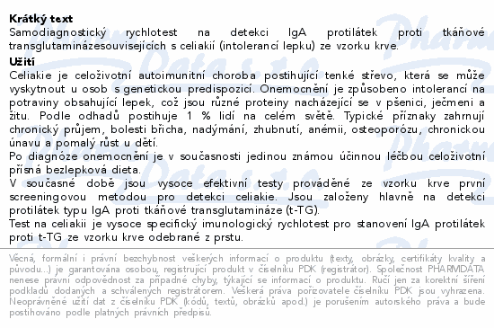 Samodiagnostický rychlotest na detekci IgA protilátek proti tkáňové transglutaminázesouvisejících s celiakií (intolerancí lepku) ze vzorku krve.
