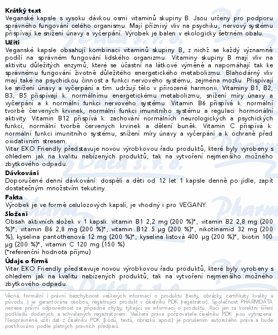 Veganské kapsle s vysoku dávkou osmi vitaminů skupiny B. Jsou určeny pro podporu správného fungování celého organismu. Mají příznivý vliv na psychiku, nervový systému přispívají ke snížení únavy a vyčerpání. Výrobek je balen v ekologicky šetrném obalu.