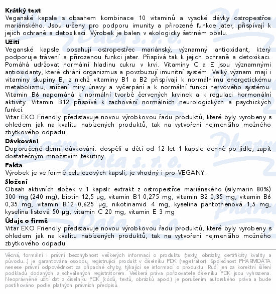 Veganské kapsle s obsahem kombinace 10 vitaminů a vysoké dávky ostropestřce mariánského. Jsou určeny pro podporu imunity a přirozené funkce jater, přispívají k jejich ochraně a detoxikaci. Výrobek je balen v ekologicky šetrném obalu.
