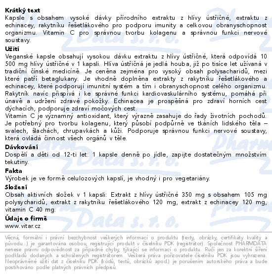 Kapsle s obsahem vysoké dávky přírodního extraktu z hlívy ústřičné, extraktu z echinacey, rakytníku řešetlákového pro podporu imunity a celkovou obranyschopnost organizmu. Vitamin C pro správnou tvorbu kolagenu a správnou funkci nervové soustavy.