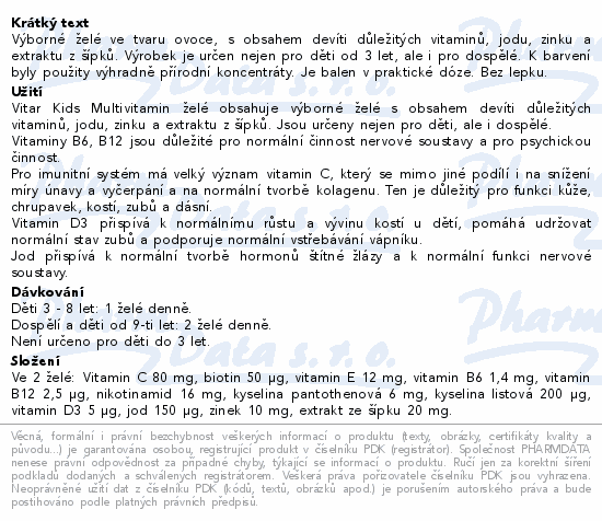 Výborné želé ve tvaru ovoce, s obsahem devíti důležitých vitaminů, jodu, zinku a extraktu z šípků. Výrobek je určen nejen pro děti od 3 let, ale i pro dospělé. K barvení byly použity výhradně přírodní koncentráty. Je balen v praktické dóze. Bez lepku.