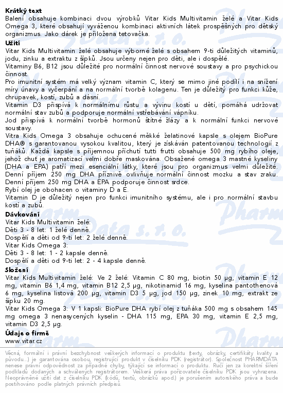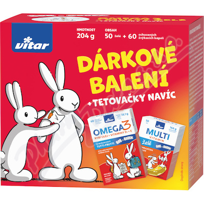 Balení obsahuje kombinaci dvou výrobků Vitar Kids Multivitamin želé a Vitar Kids Omega 3, které obsahují vyváženou kombinaci aktivních látek prospěšných pro dětský organizmus. Jako dárek je přiložena tetovačka.