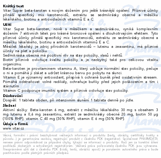 Vitar Super beta-karoten s novým složením pro ještě krásnější opálení. Příznivé účinky přináší specifický mix karotenoidů, extraktu se sedmikrásky obecné a měsíčku lékařského, biotinu a antioxidačních vitaminů E a C.