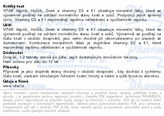 VITAR Vápník, Hořčík, Zinek a vitaminy D3 a K1 obsahuje minerální látky, které se významně podílejí na udržení normálního stavu kostí a zubů. Podporují jejich správný vývoj. Vitaminy D3 a K1 napomáhají lepšímu vstřebávání a využitelnosti vápníku.