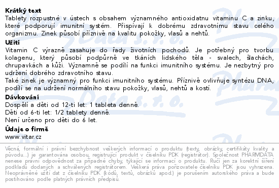 Tablety rozpustné v ústech s obsahem významného antioxidatnu vitaminu C a zinku, které podporují imunitní systém. Přispívají k dobrému zdravotnímu stavu celého organizmu. Zinek působí příznivě na kvalitu pokožky, vlasů a nehtů.