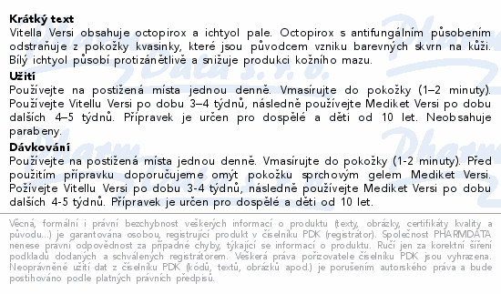 Vitella Versi obsahuje octopirox a ichtyol pale. Octopirox s antifungálním působením odstraňuje z pokožky kvasinky, které jsou původcem vzniku barevných skvrn na kůži. Bílý ichtyol působí protizánětlivě a snižuje produkci kožního mazu.