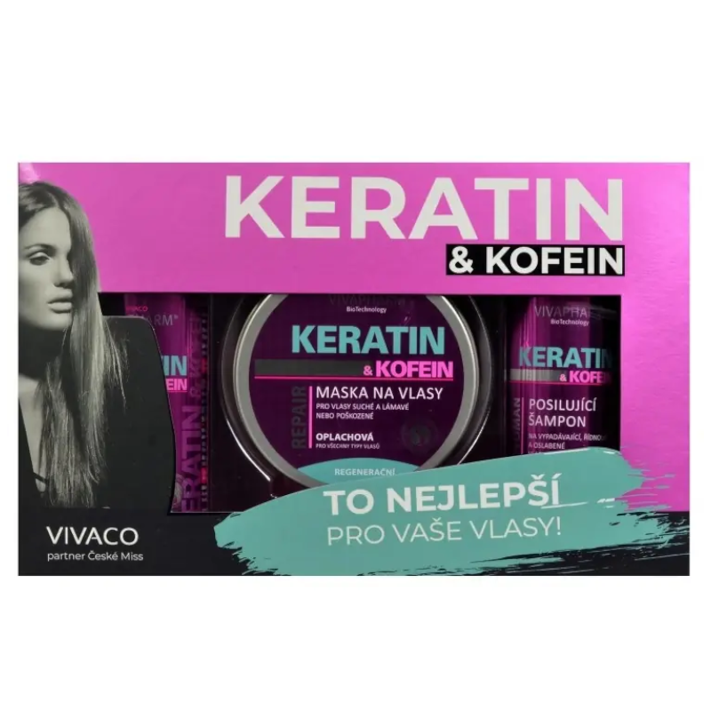 Dárková kazeta obsahuje: vlasový šampon keratin 200ml, vlasový balzám keratin 200ml, vlasovou masku keratin 200ml.