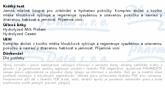 Jemná mléčná koupel pro zvláčnění a hydrataci pokožky. Komplex složek z kozího mléka hloubkově vyživuje a regeneruje vysušenou a unavenou pokožku a navrací ji ztracenou hebkost a jemnost. Příjemně voní.