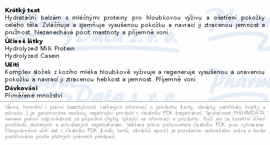 Hydratační balzám s mléčnými proteiny pro hloubkovou výživu a ošetření pokožky celého těla. Zvláčňuje a zjemňuje vysušenou pokožku a navrací ji ztracenou jemnost a pružnost. Nezanechává pocit mastnoty a příjemně voní.