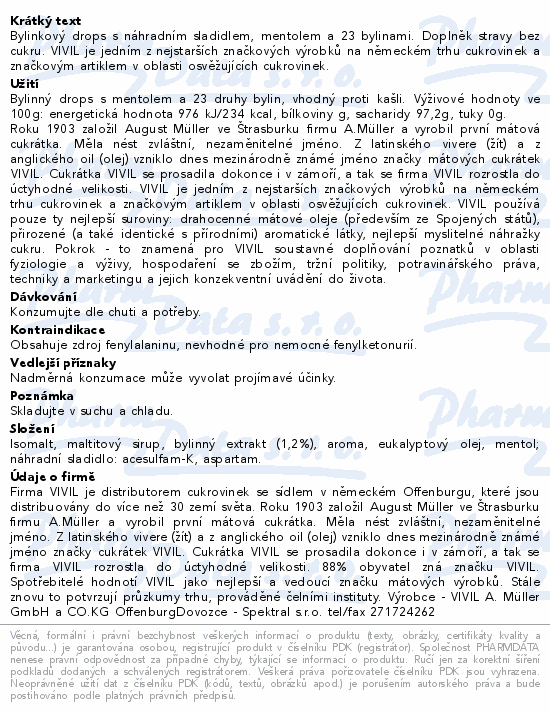 Bylinkový drops s náhradním sladidlem, mentolem a 23 bylinami. Doplněk stravy bez cukru. VIVIL je jedním z nejstarších značkových výrobků na německém trhu cukrovinek a značkovým artiklem v oblasti osvěžujících cukrovinek.