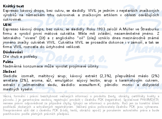 Espresso kávový drops, bez cukru, se sladidly. VIVIL je jedním z nejstarších značkových výrobků na německém trhu cukrovinek a značkovým artiklem v oblasti osvěžujících cukrovinek.