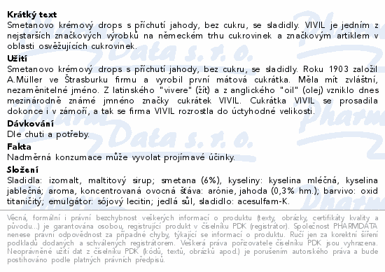 Smetanovo krémový drops s příchutí jahody, bez cukru, se sladidly. VIVIL je jedním z nejstarších značkových výrobků na německém trhu cukrovinek a značkovým artiklem v oblasti osvěžujících cukrovinek.